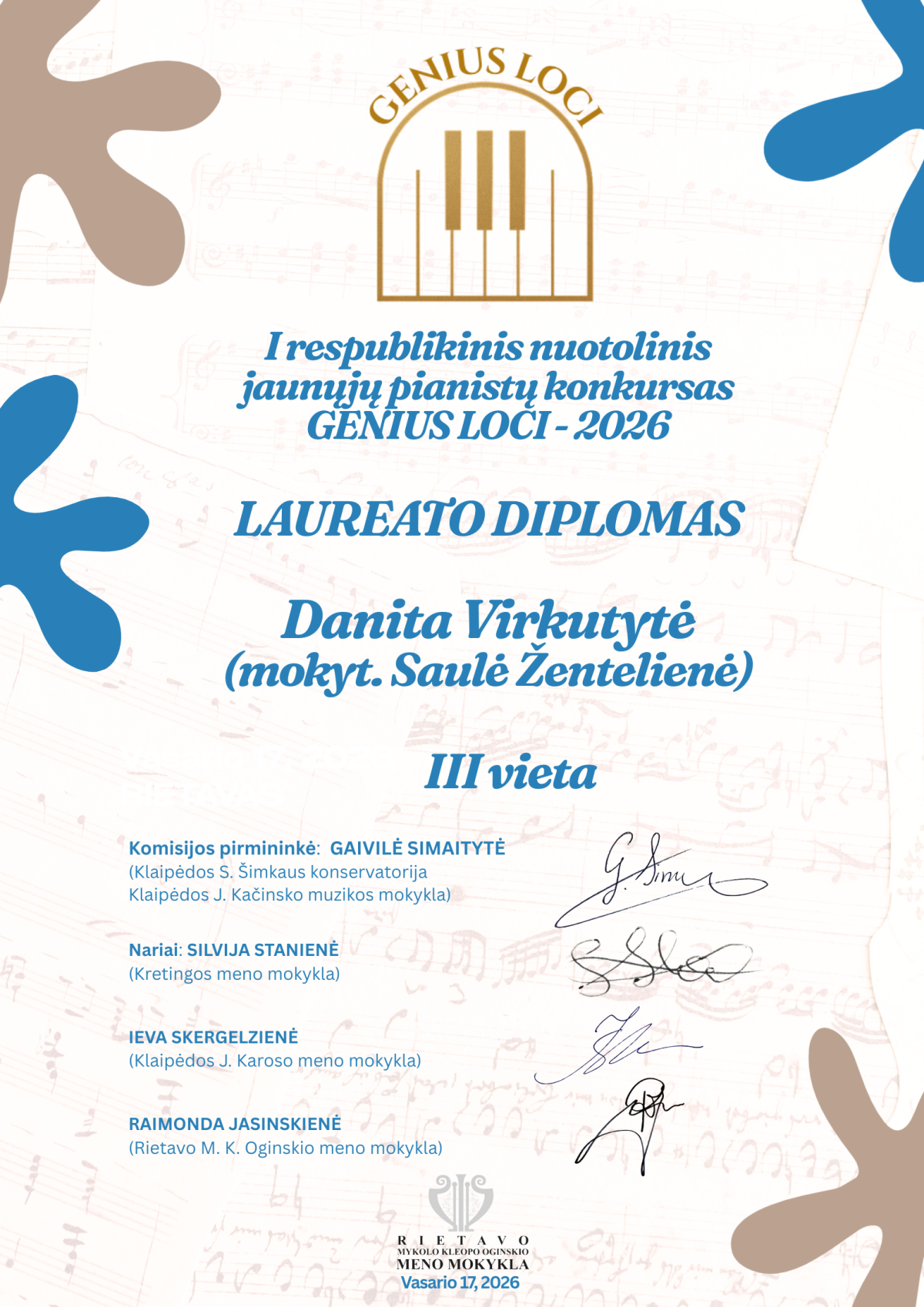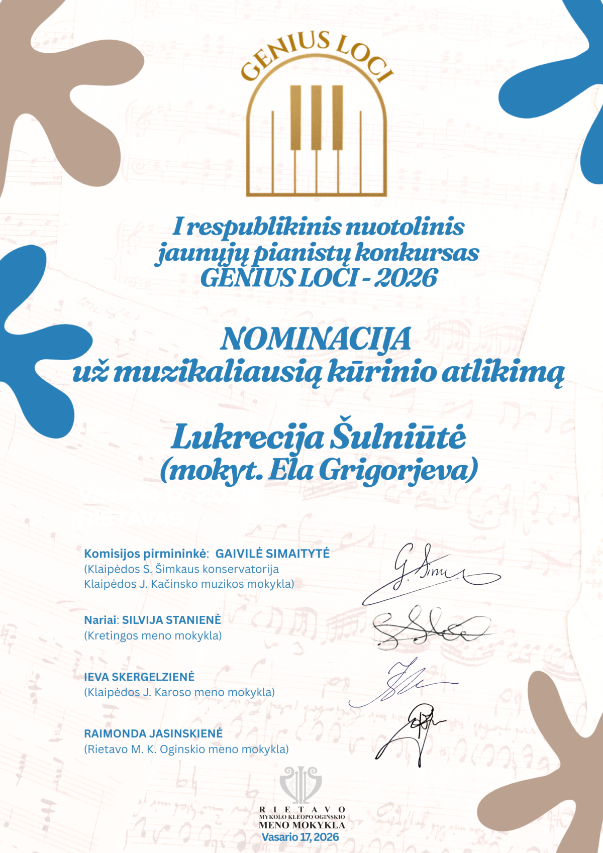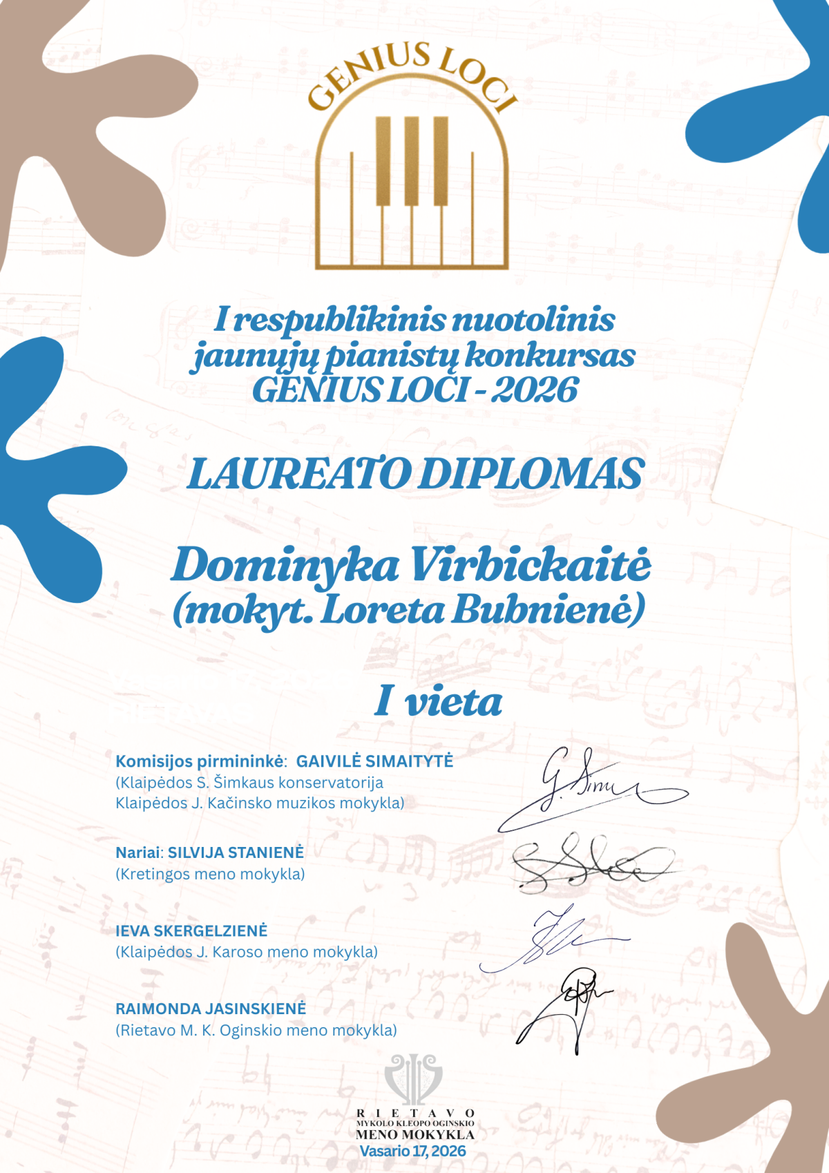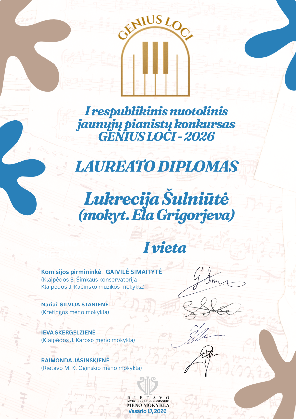 Džiaugiamės puikiais mokinių pasiekimais I respublikiniame nuotoliniame jaunųjų pianistų konkurse „GENIUS LOCI–2026“!