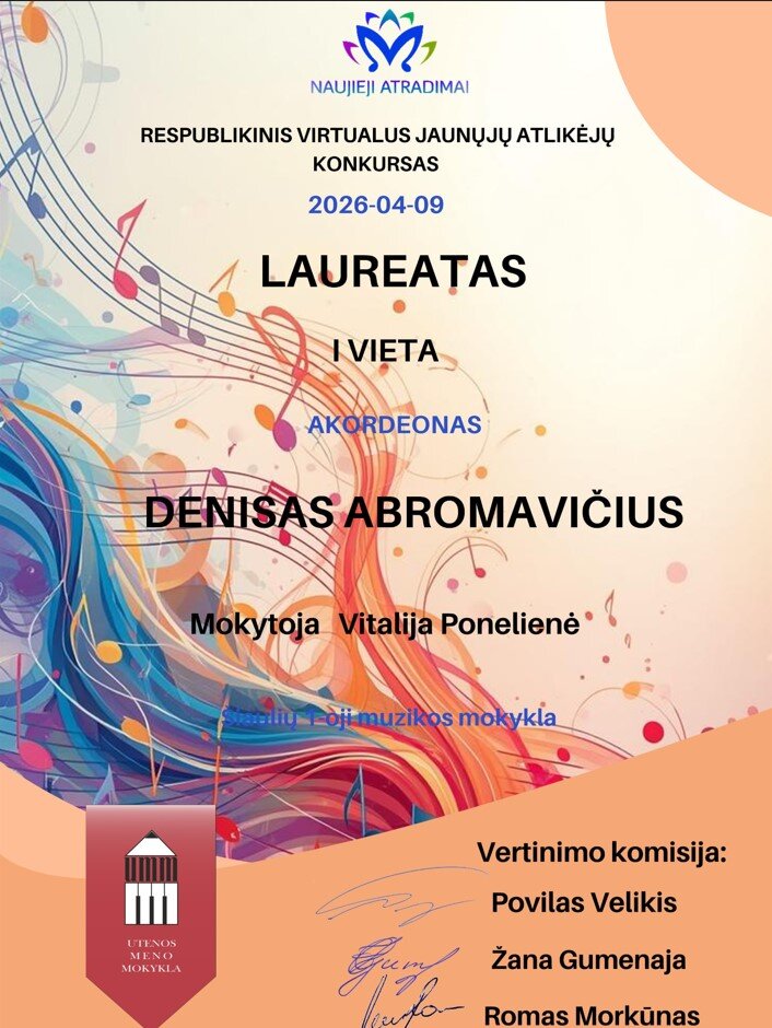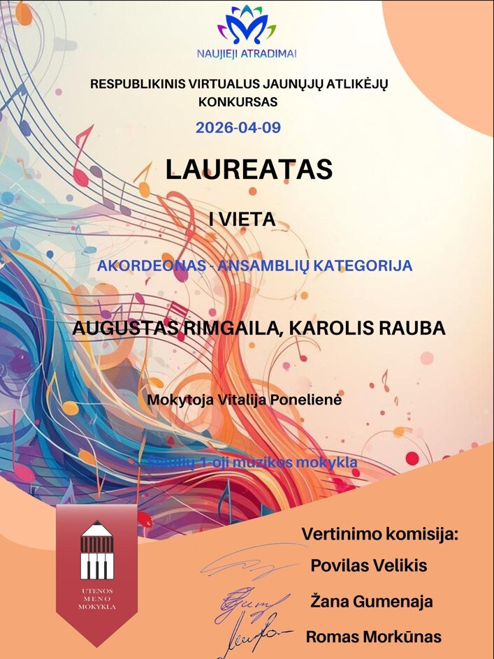 2026 m. balandžio 9 d. baigėsi Respublikinis virtualus jaunųjų atlikėjų konkursas ,,Naujieji atradimai -2026“, kurį organizavo Utenos meno mokykla. Konkurse dalyvavo daugiau nei 500 skirtingais muzikos instrumentais grojančių jaunųjų talentų iš įvairių šalies ugdymo įstaigų, kurių pasirodymus vertino profesionali komisija ir scenos menų atstovai. Šiaulių 1 -osios muzikos mokyklos akordeonistai, dalyvavę šiame konkurse, buvo įvertinti laureatų diplomais: Denisas Abromavičius 1 vieta (solo kategorija), Augustas Rimgaila ir Karolis Rauba 1 vieta (ansamblių kategorija). Sveikiname Denisą, Augustą ir Karolį bei jų mokytoją Vitaliją Ponelienę su puikiais pasiekimais ir įverinimu.