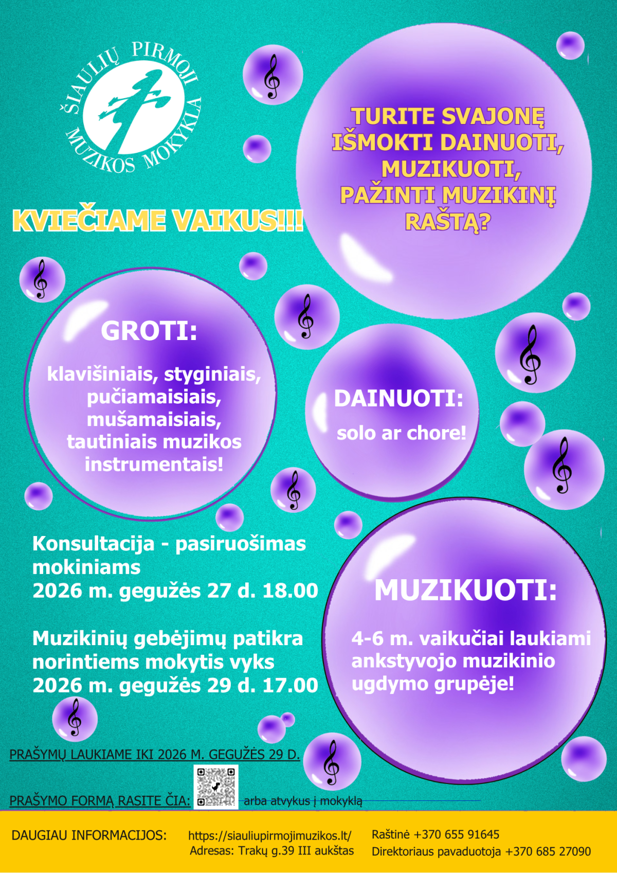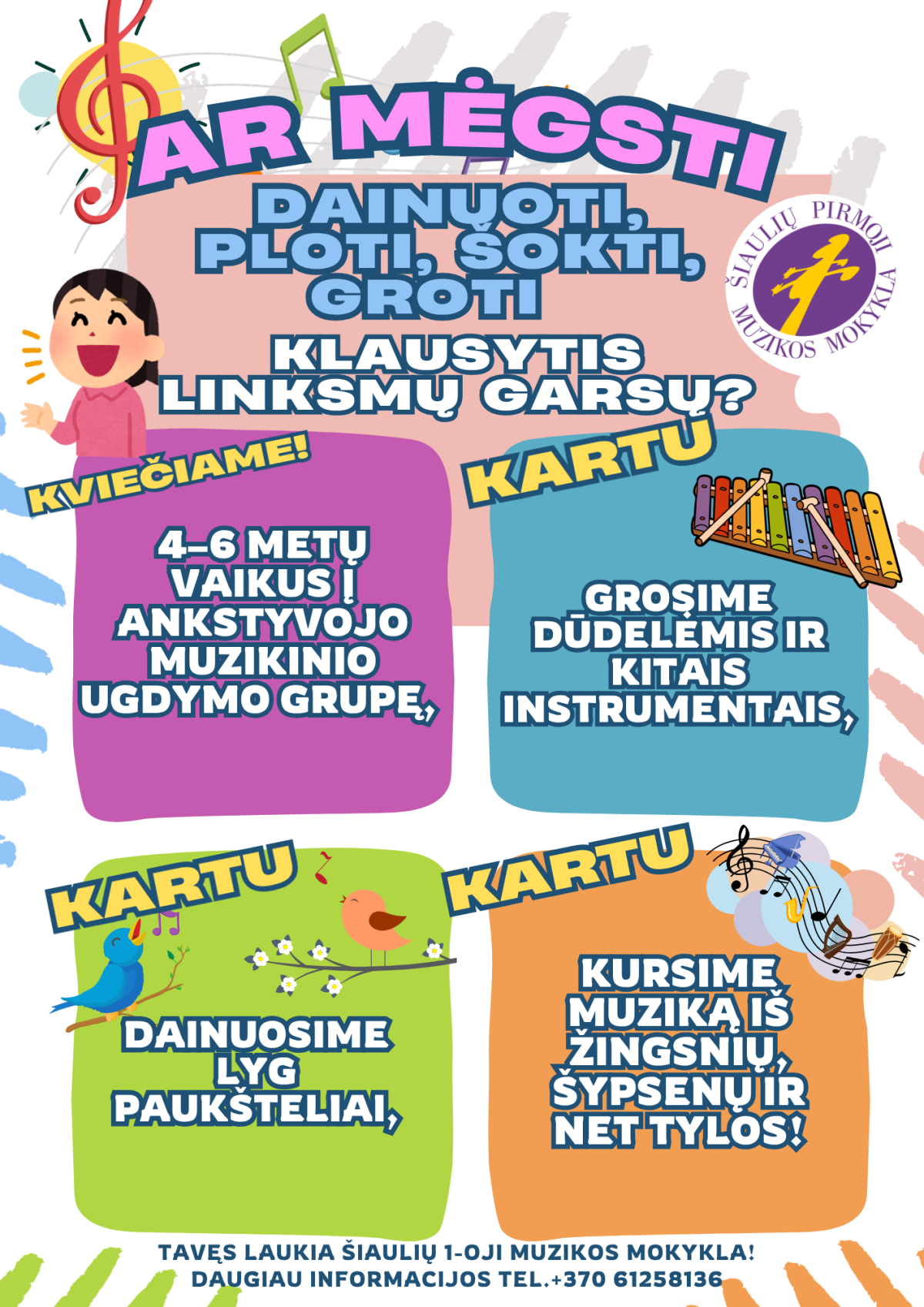 ŠIAULIŲ 1-OJI MUZIKOS MOKYKLA KVIEČIA MUZIKUOTI: fortepijonu, smuiku, violončele, gitara, fleita, saksofonu, trimitu, eufonija, kanklėmis, birbyne, akordeonu, mušamaisiais muzikos instrumentais, mokytis dainuoti solo ar chore!
